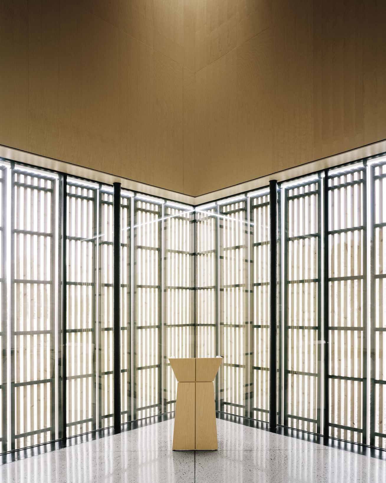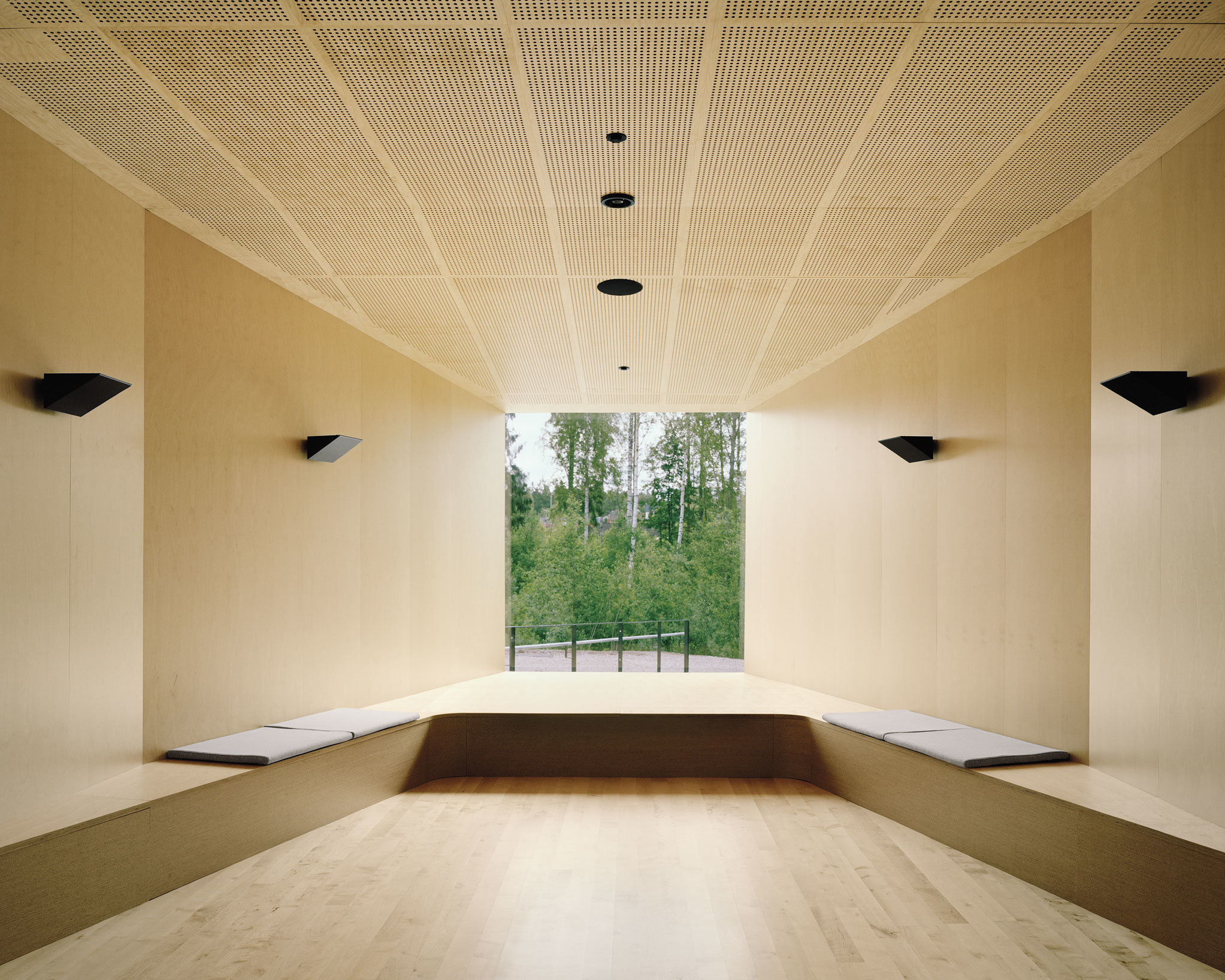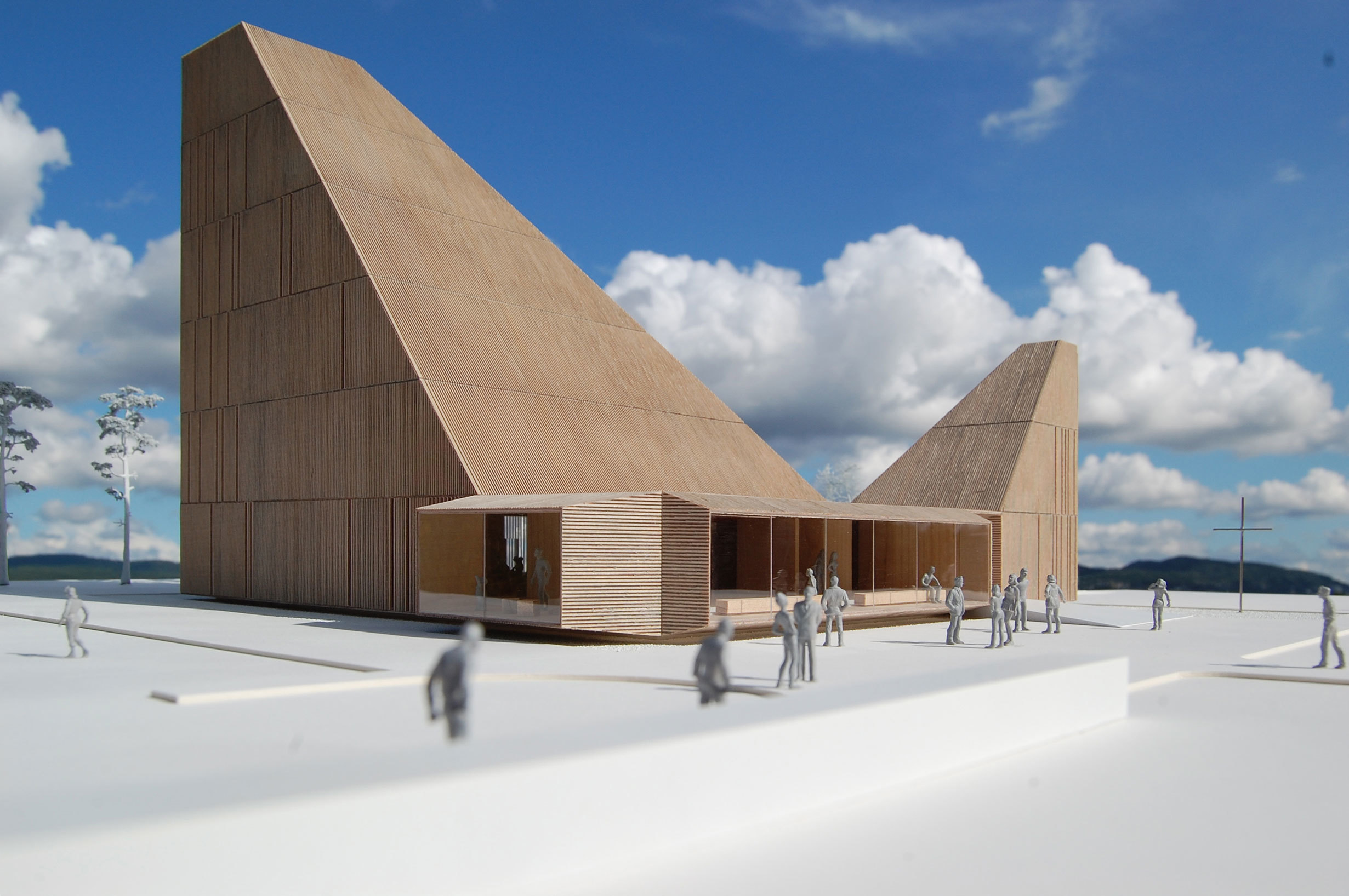 The main story of the liturgy has become the narrative of the church: from fire to resurrection. The new church is located on the existing processional axis, and clad in straight board of heartwood pine, reflecting the local forest landscape. The interior is covered in birch plywood. The artistic elaboration in the interior seeks to “eradicate” the reality of the loadbearing steel structure and achieve an expression of lightness. The towers mark the main liturgical spaces, the church hall and the baptistery, rising from a common cast concrete plinth, the “bedrock” of the church.