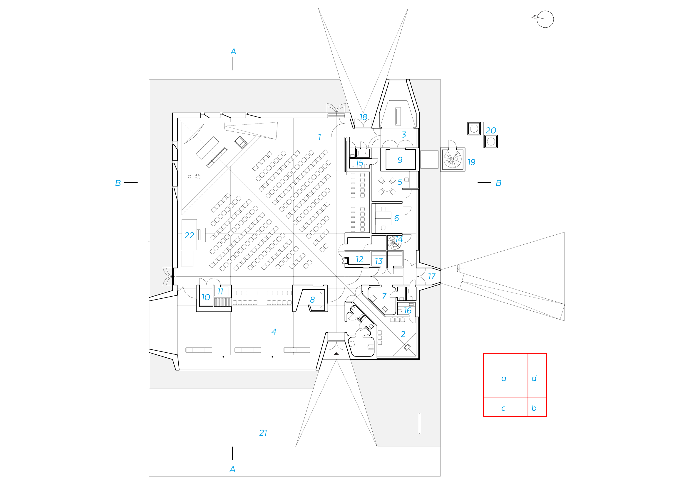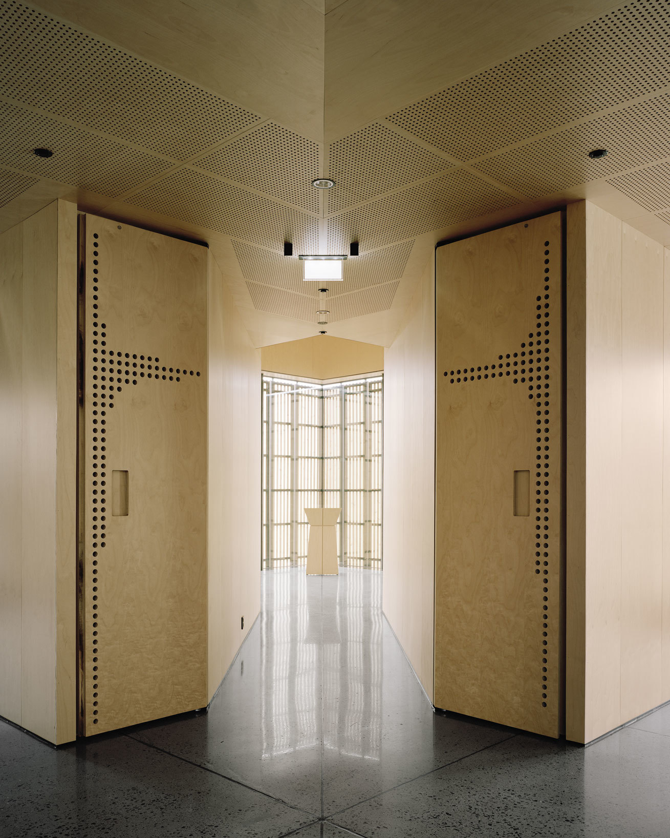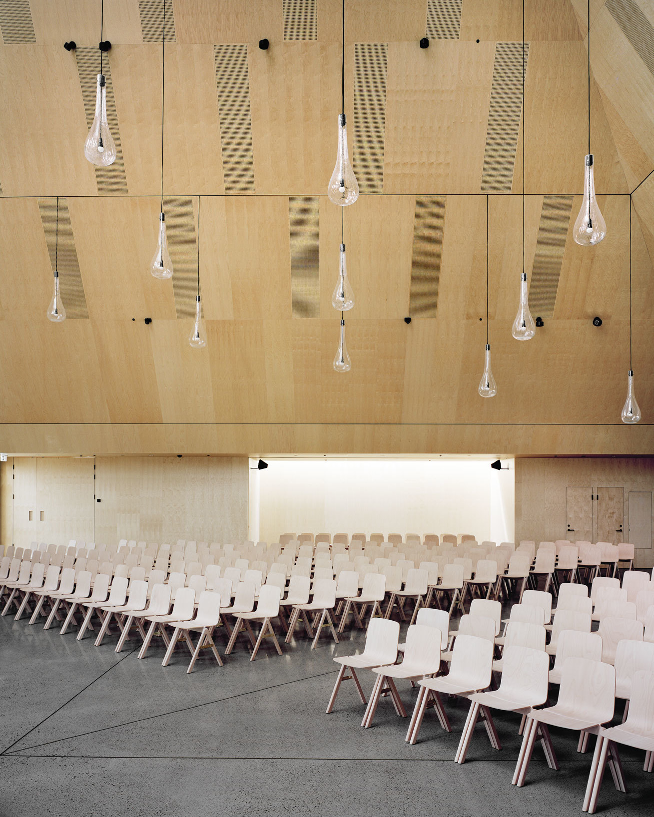 The main story of the liturgy has become the narrative of the church: from fire to resurrection. The new church is located on the existing processional axis, and clad in straight board of heartwood pine, reflecting the local forest landscape. The interior is covered in birch plywood. The artistic elaboration in the interior seeks to “eradicate” the reality of the loadbearing steel structure and achieve an expression of lightness. The towers mark the main liturgical spaces, the church hall and the baptistery, rising from a common cast concrete plinth, the “bedrock” of the church.