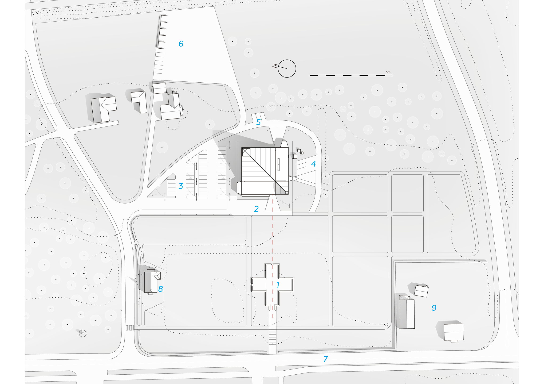 Fotavtrykket til den gamle kirken er murt opp til en minnelund. Den nye kirken er plassert med hovedinngangen midt i prosesjonsaksen til den gamle kirken for å gi en historisk kontinuitet og få den gamle kirkegården og den nye kirken til å fremstå som et helhetlig anlegg.