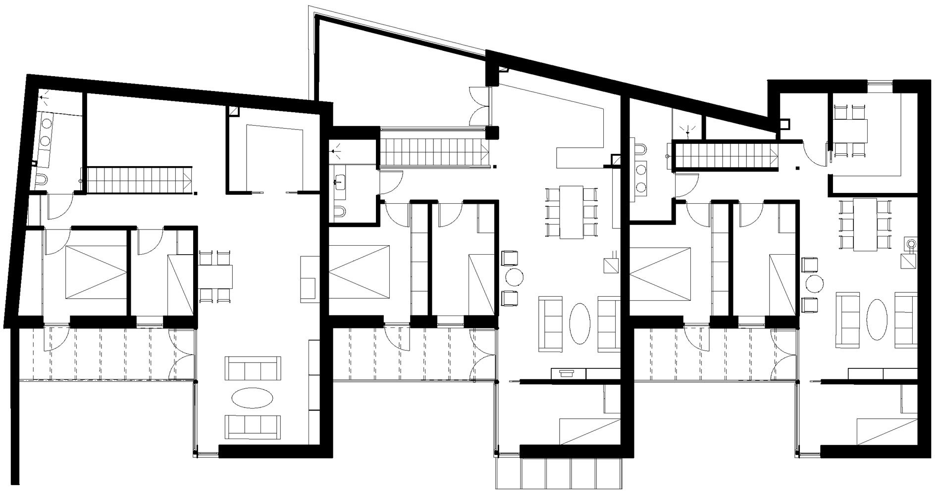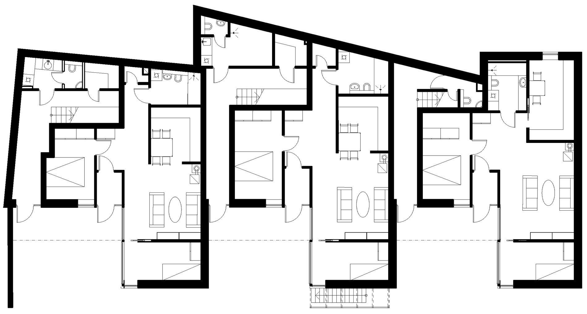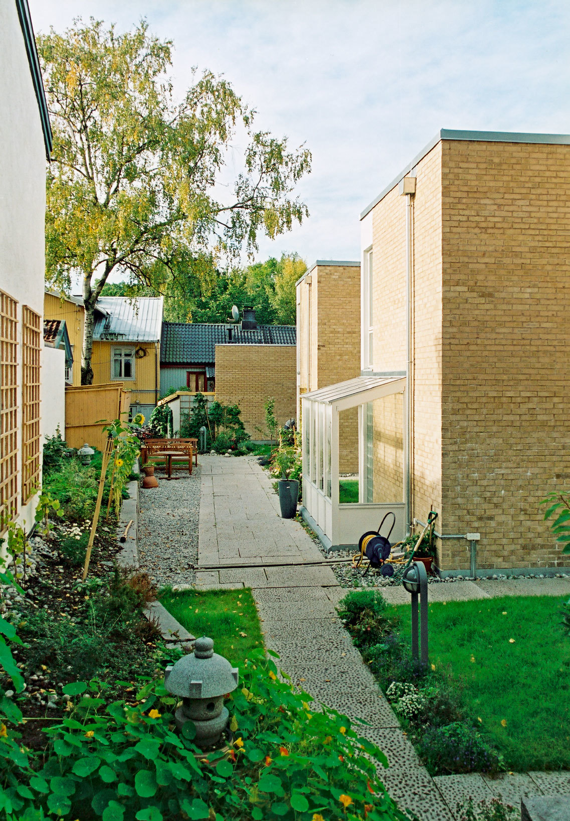 The brief was to build a maximum number of dwelling units with good external areas on a narrow site with party walls in three sides. The site is located in an area consisting of old protected timber houses.