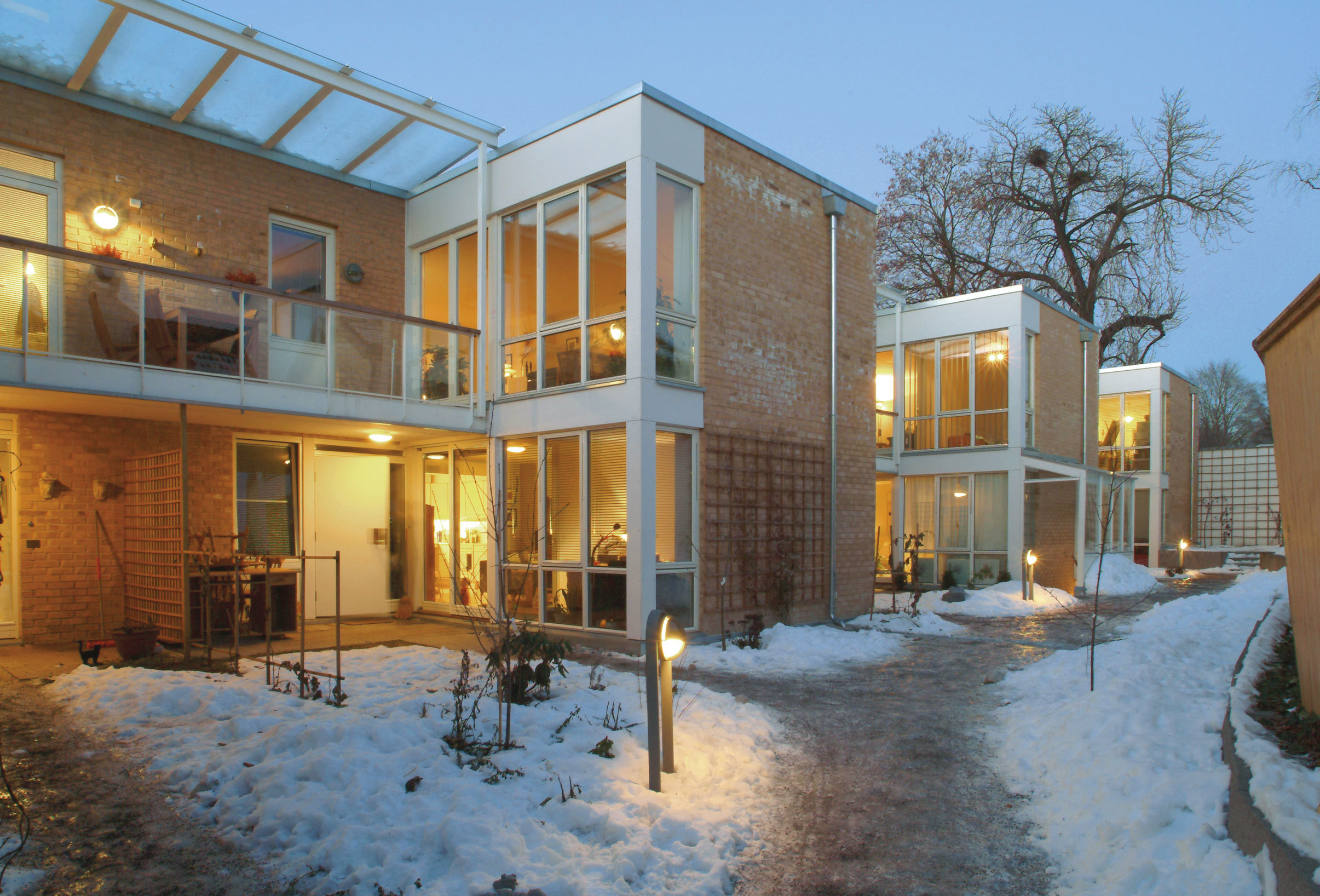 Bebyggelsen er oppført i to etasjer og er delt opp i tre hus. Hvert av husene er bygget opp rundt et lite atrium som inneholder innganger og små private hageparseller for de to leilighetene i huset. Atriene vender mot sydvest. Oppdelingen av bygningskroppen omkring atriene gir leiligheter og uterom gode solforhold samtidig som bebyggelsen får intime dimensjoner. Sydvestfasadene er utnyttet til maksimalt lysinnfall uten sjenerende innkikk. Småleiligheter på terreng er ensidig vendt mot atriet, mens de store leilighetene i 2. etasje har overlys og inntrukket takterrasse som dagslyskilde i tillegg til sydvestfasade.