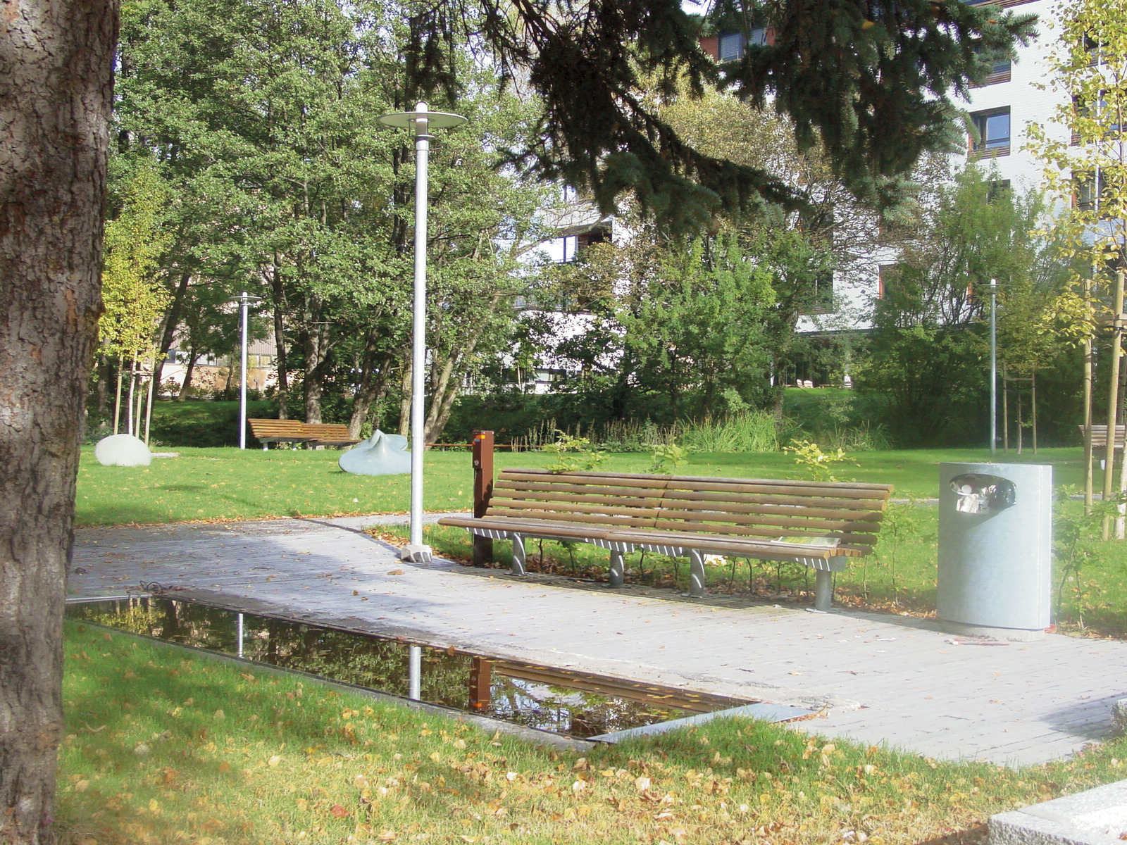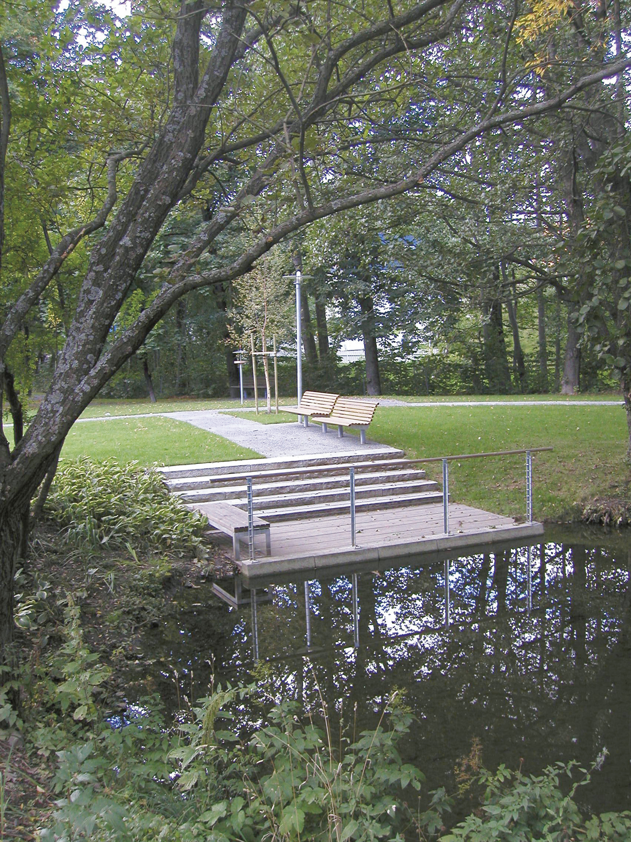 Sognsvannsbekkens sideløp er rensket opp og løpet gjort dypere. Ved sideløpets inn- og utløp ble det bygget terskler som gir jevnt tilsig av vann. Ned mot vannet er det plantet skyggetålende og vannelskende planter. Stiene er i lys plasstøpt betong som gir stødig og jevnt underlag for gående og rullestolbrukere. To broklopper i granitt er lagt over bekkeløpene, og en smal plattform i tre fører over til en holme, for å skape gangforbindelse til ulike deler av parkanlegget.