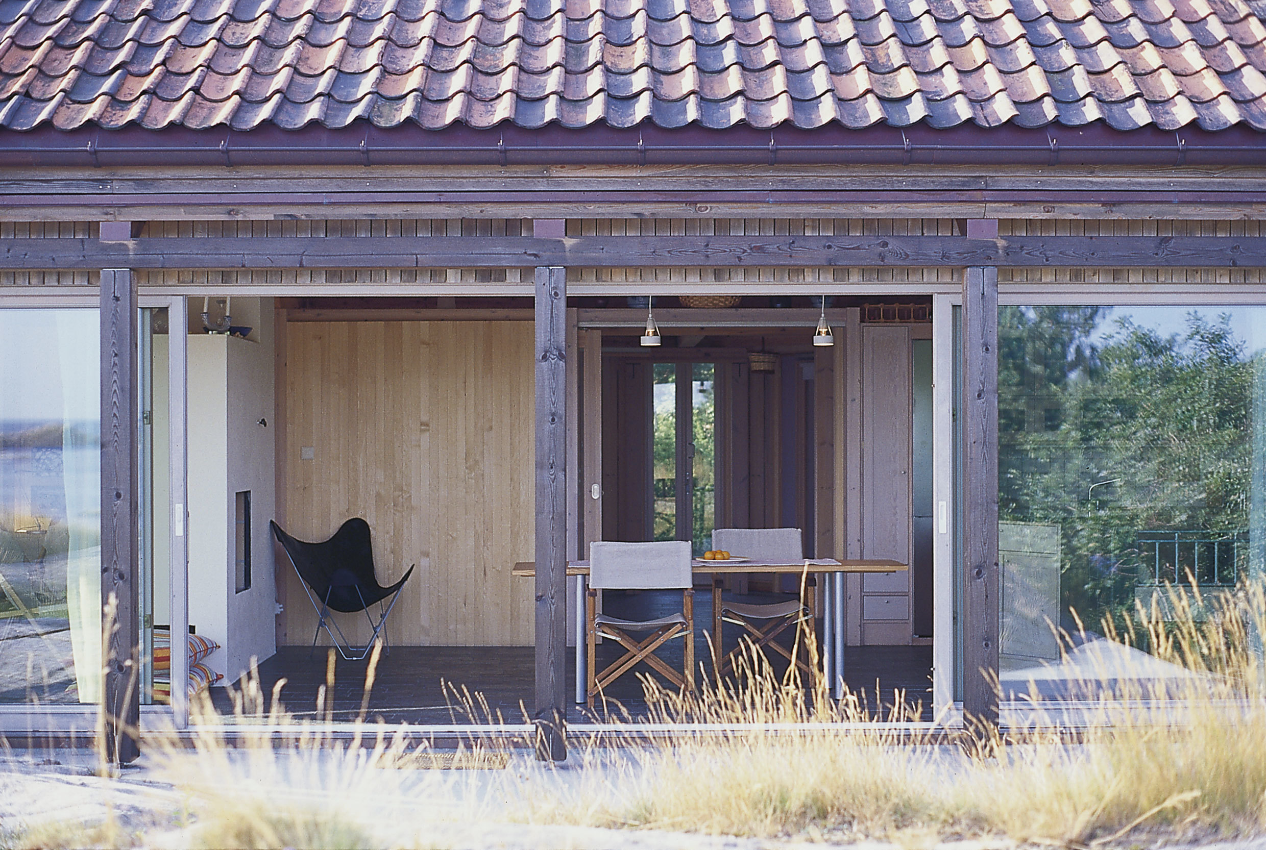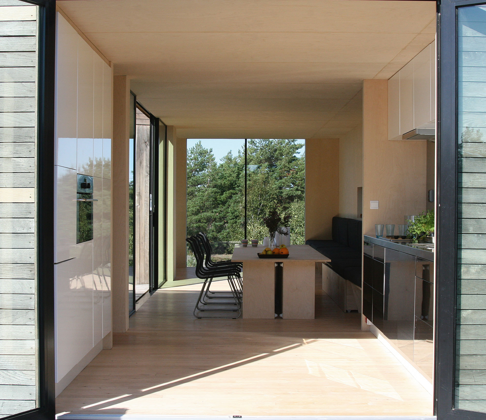 The site is on the Finnish island Åland, located 50 metres from the sea. The building is conceived as a long, continuous timber structure, a folded structure you can move along and through, over and under, and architectonic landscape forming all the elements of the house: walls, floor, roof, terrace. Rooms are defined through their use, and can be used together or separated with sliding glass doors.