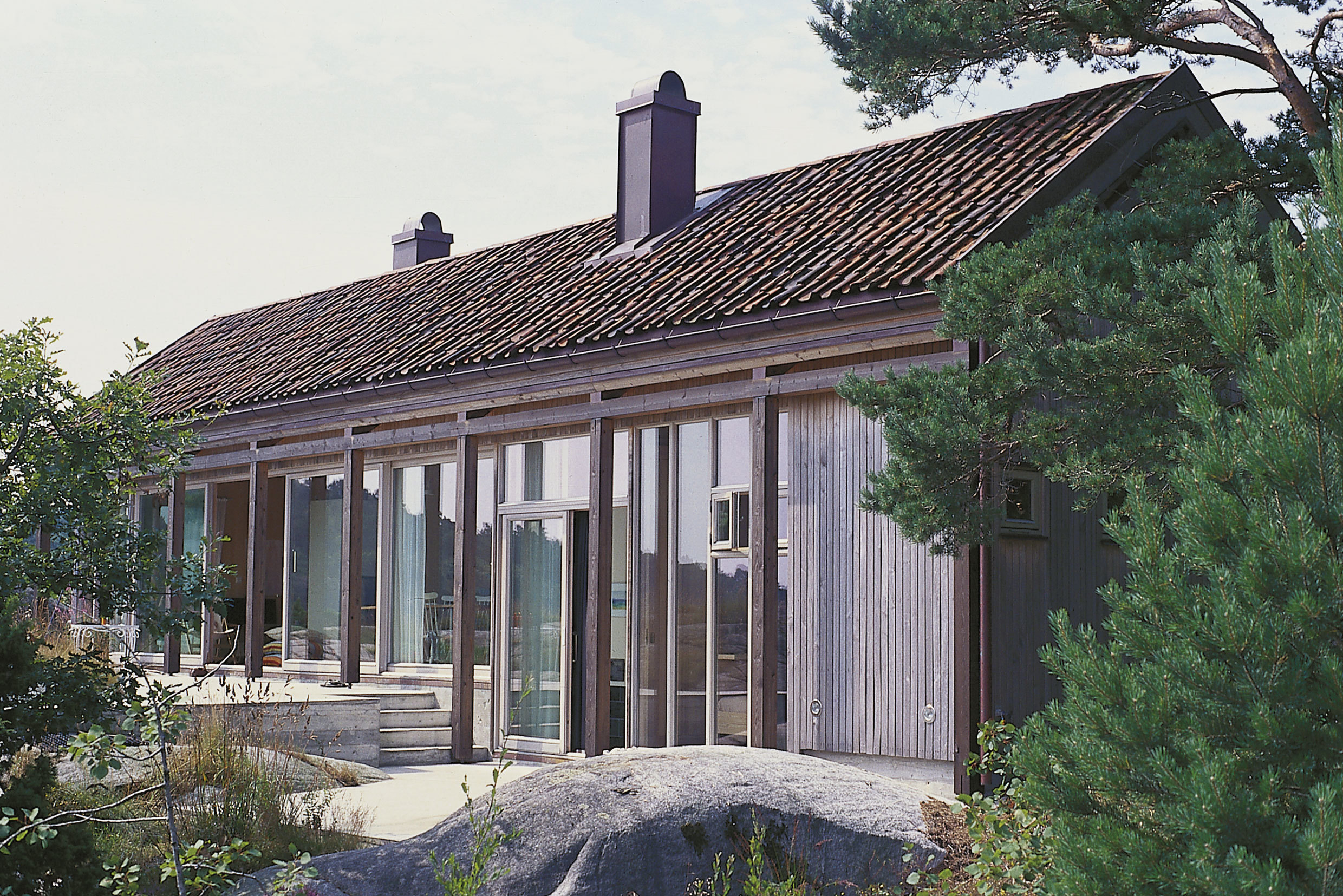 Fritidsboligen ligger på den finske øygruppen Åland, 50 m fra sjøen og litt tilbaketrukket mellom trærne. Brutto areal er 42 kvm.