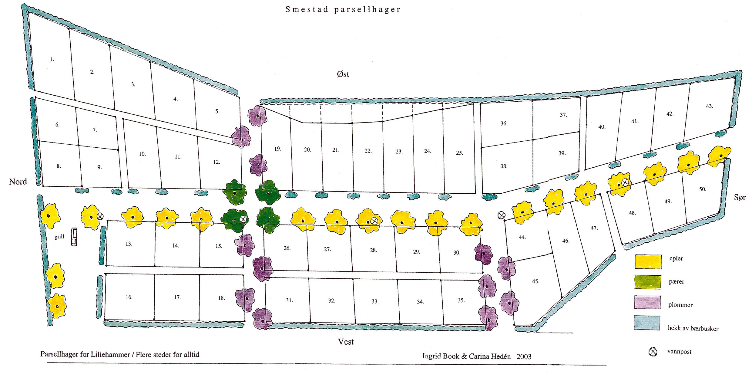 Parsellhagene skal omkranses av hekker med solbær, rips og stikkelsbær. Området er oppmålt og markert med stolper og snøre, strukturert med gangveier, og skal beplantes med utvalgte sorter av frukttrær – herdige eplesorter som Transparente Blanche, Rød Haugmann, Katinka, Röd Melba og Huvitus; pærer som Gråpære, Anna, Esperens herre og Augustipærer (Experimentalfältets); og plommer som Czar, Herman, Opal og Tunaplommer.