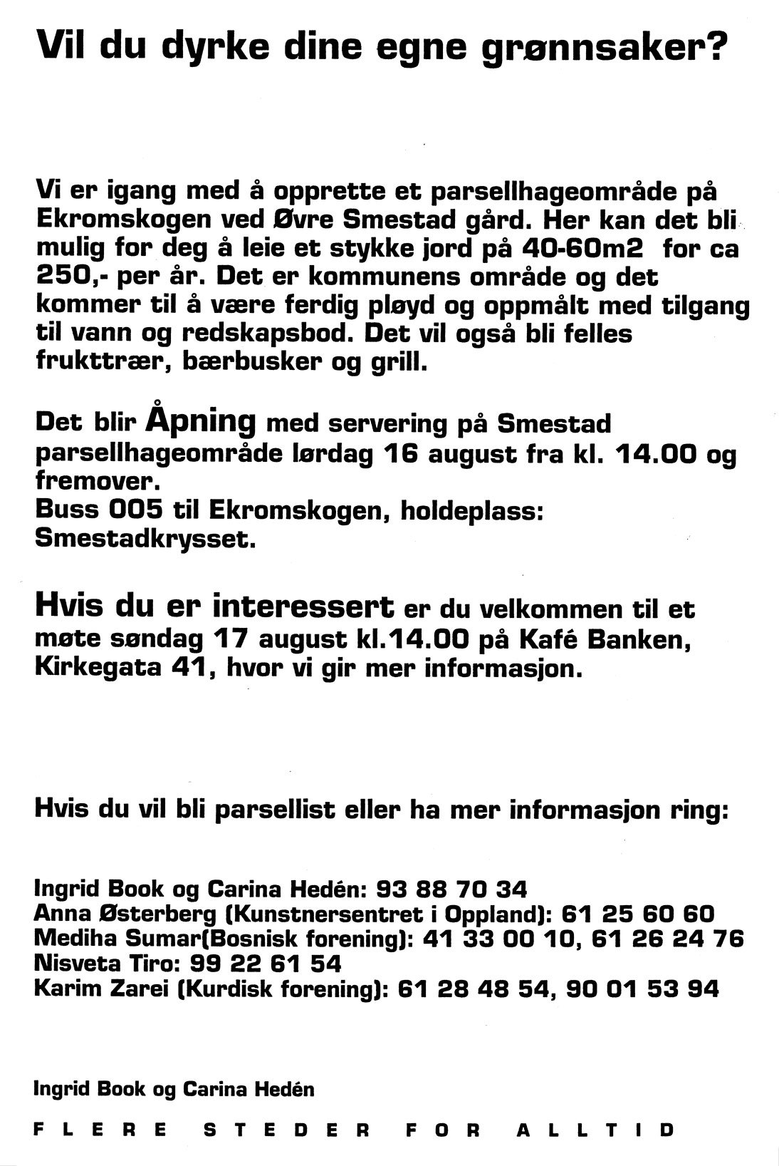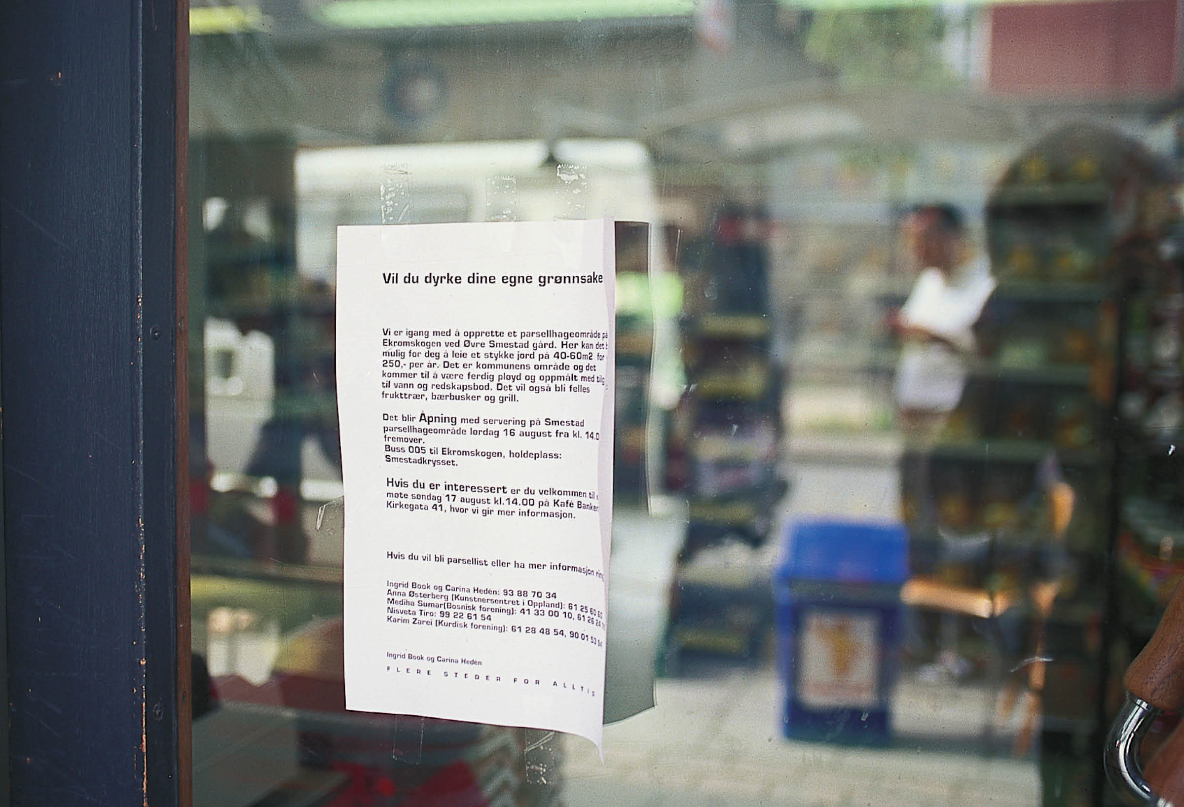 Kunstnerne Ingrid Book og Carina Hedén var ansvarlige for «Midlertidige utopier», et utstillingskonsept for Museet for Samtidskunst i 2003 i forbindelse med Makt- og demokratiutredningen. I forbindelse med utstillingsprosjektet «Flere steder for alltid» satte de i gang et prosjekt for utvikling av parsellhager i Lillehammer.