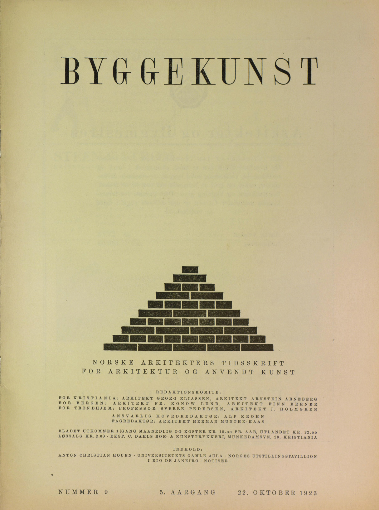 Redaktør for nr. 9-1923 var Alf Krohn. Fagredaktør: Herman Munthe-Kaas. I redaksjonskomiteen satt Georg Eliassen, Arnstein Arneberg, Fr. Konow Lund, Finn Berner, Sverre Pedersen, H. Grendahl.