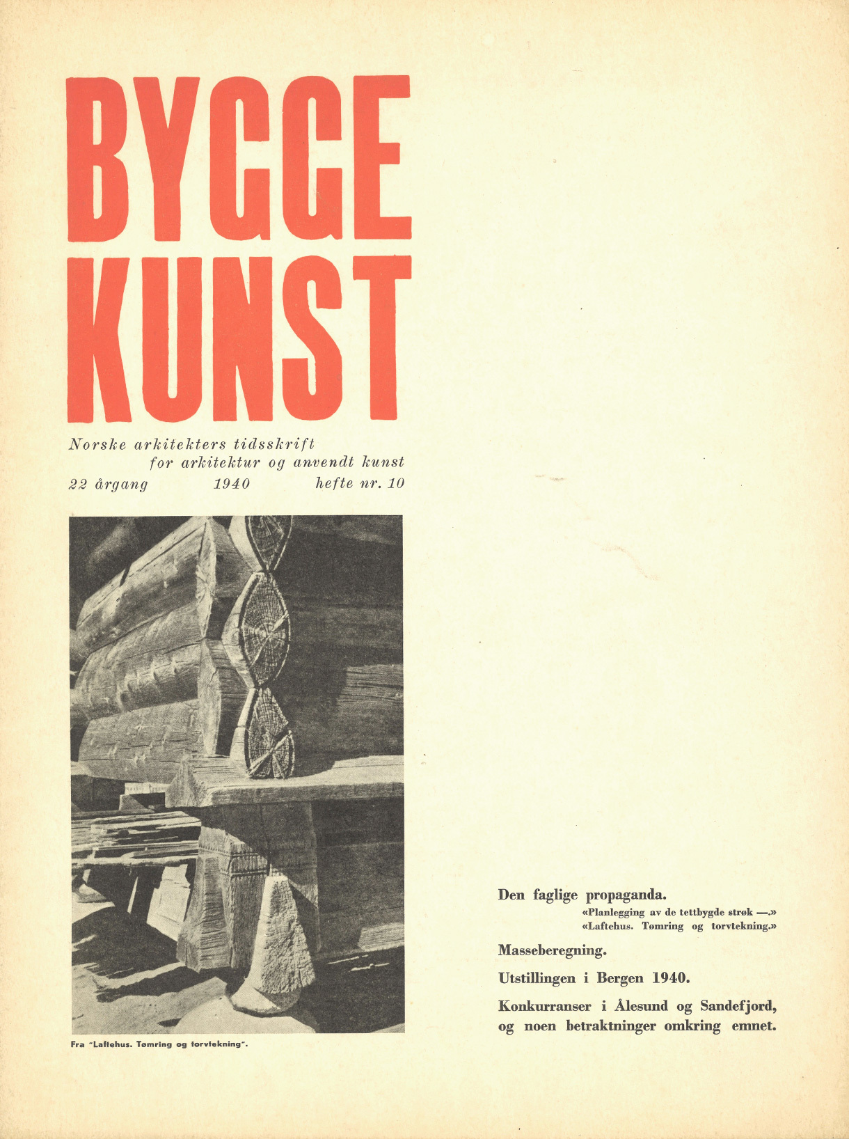 Redaktør for nr. 10-1940 var Eyvind Alnæs. Redaksjon: ark. Gunnar Ø. Jørgen, ark. Reidar Lund, ark. Herman Munthe-Kaas, Oslo. Utvalg fra Bergen: Ark. Johan Lindstrøm, ark. G. F. Fasting. For Trondheim: ark K. Kielland, ark Herman Semmelmann. For Stavanger: Ark. L. Imsland, ark. T. Sørensen. Disponent: redaktør Alf Krohn.