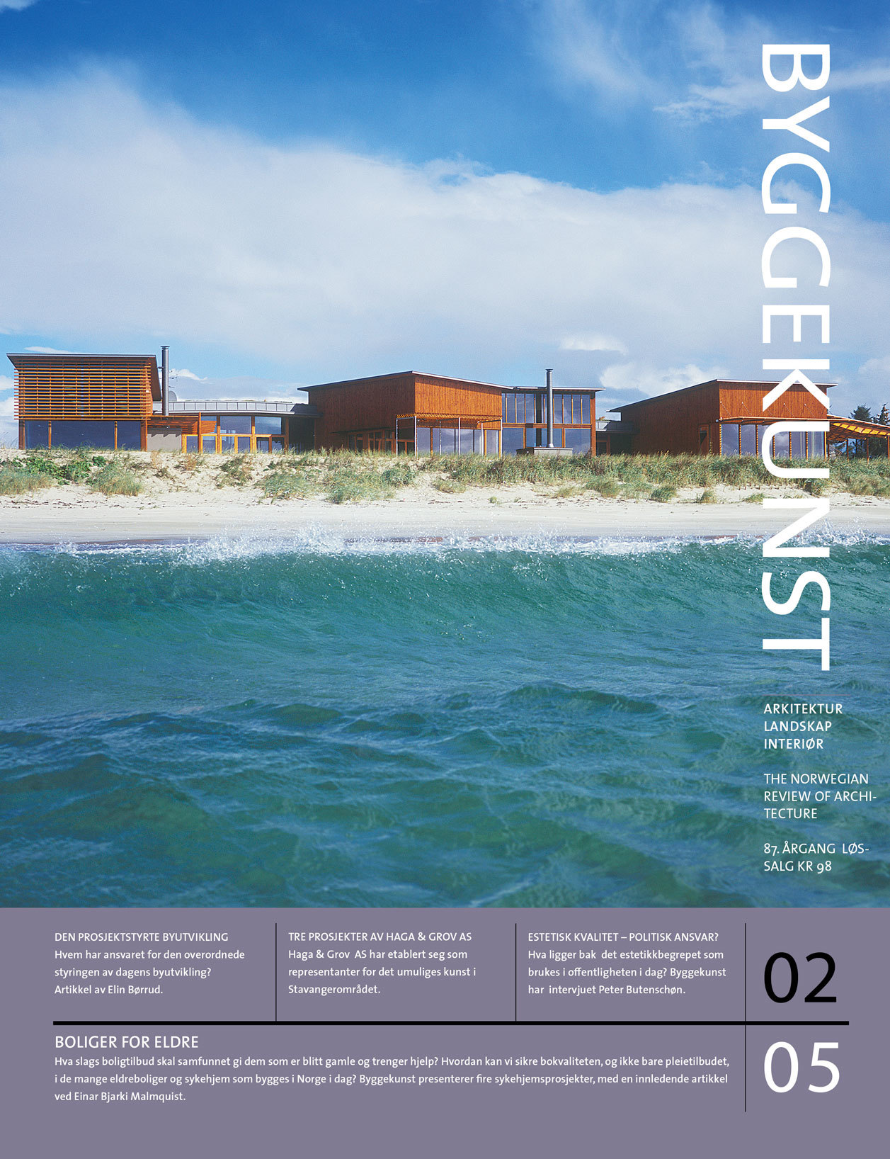 Boliger for eldre – Hva slags boligtilbud skal samfunnet gi dem som er blitt gamle og trenger hjelp? Hvordan kan vi sikre bokvaliteten, og ikke bare pleietilbudet, i de mange eldreboliger og sykehjem som bygges i Norge i dag? Byggekunst presenterer fire sykehjemsprosjekter, med en innledende artikkel ved Einar Bjarki Malmquist.